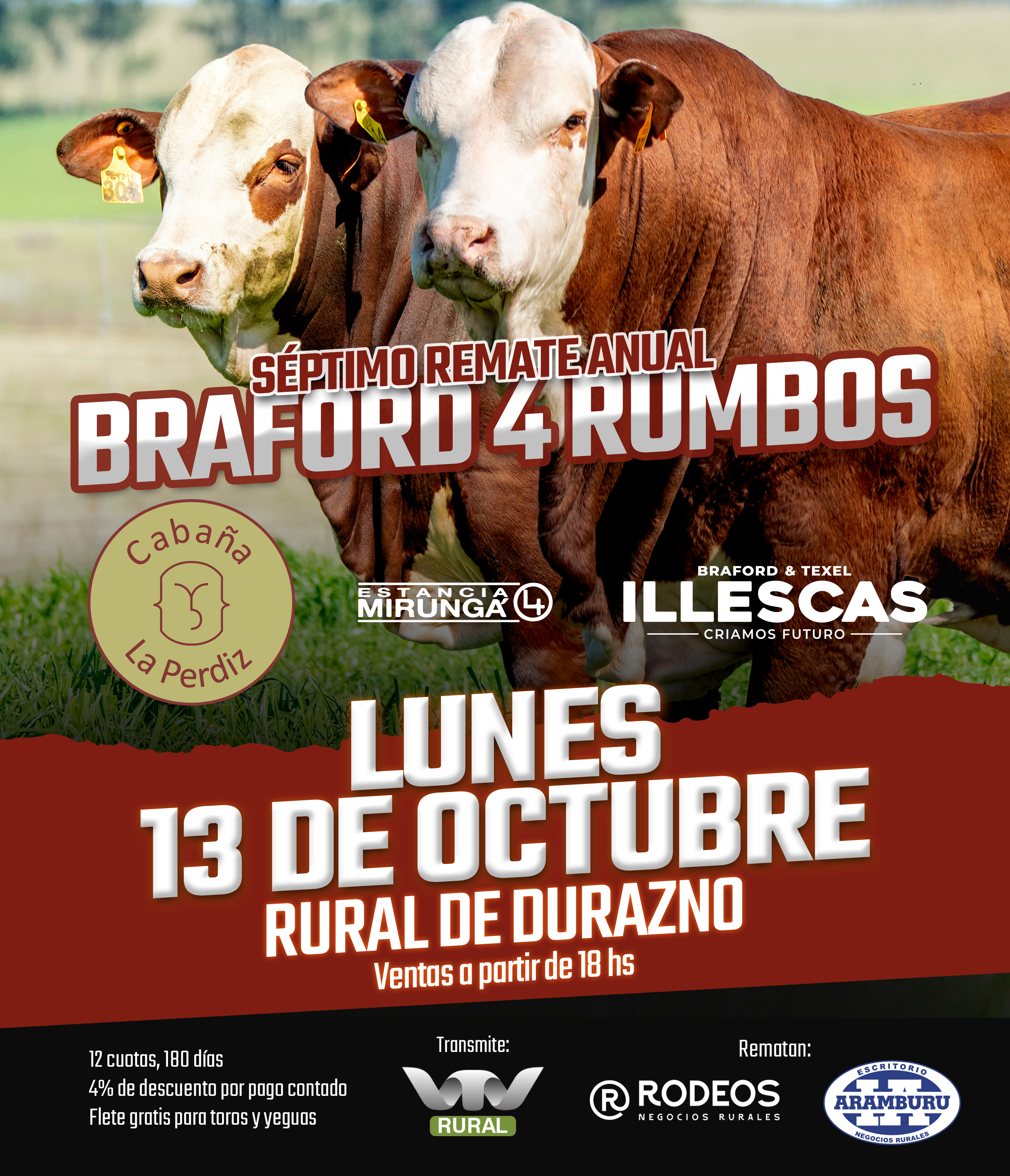El próximo Lunes 13 de Octubre a las 15 hs. se realizará el 7º Remate Anual Braford 4 Rumbos en en la Sociedad Rural de Durazno.